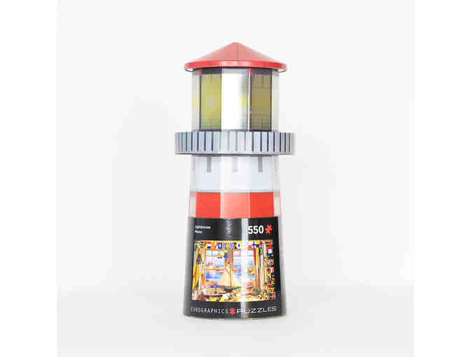 The puzzle is stored in a unique embossed tin shaped like a lighthouse, making it a delightful collector's item and a practical storage solution.