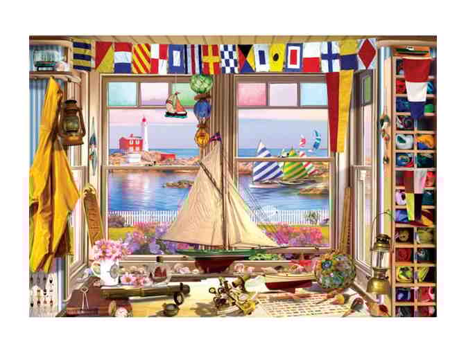 Set sail on a puzzling adventure with the Lighthouse Tin 550-piece puzzle by Eurographics! This vibrant and detailed puzzle showcases a charming view of a lighthouse and a seaside landscape, seen through a cozy room filled with nautical treasures.