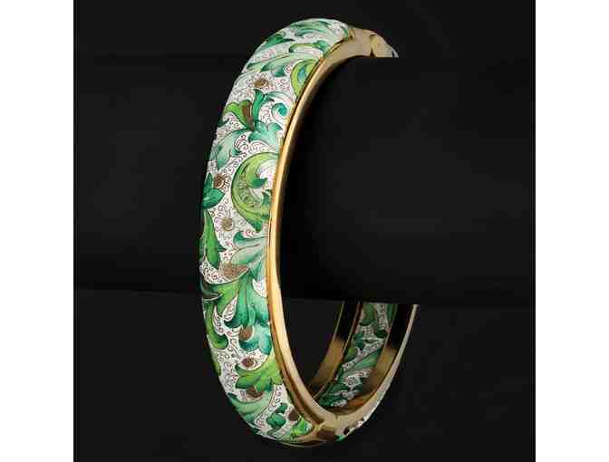 This age old art form is showcased beautifully on a hinged bangle wide enough to celebrate the exquisite pattern of flowery, graceful leaves. This design is inspired by the traditional Florentine patterns of the Renaissance that are just as admired and appreciated today as they were in the 16th century! Bid Bid Bid!
