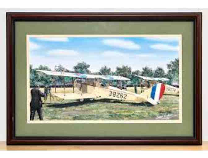 Description from Sam Lyon’s Website- Jenny JN-1 is loaded for its first regularly scheduled mail flight from Washington DC to New York City in 1918. The exact route the U.S. Postal Service used Jenny’s for airmail service was between Washington, D.C., Philadelphia, and New York in 1918! This 22 x 28 Brown Framed, Signed with Gold Name Plate, and is 54 of 300! Bid Bid Bid!
