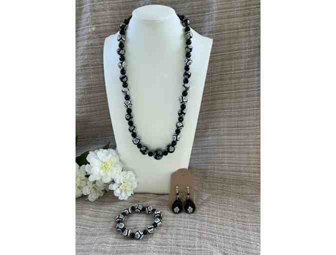 This elegant set features a black-and-white polymer clay design accented with delicate black glass beads, including a coordinating necklace, bracelet, and earrings.