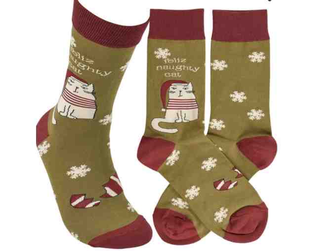 A pair of colorful woven socks from our Holiday Pet Collection displaying a sassy cat in a Santa hat and broken ornament with a fun pet-themed sentiment that reads "Feliz Naughty Cat." Seasonal socks feature a one size fits most design made with cotton, nylon, and spandex.