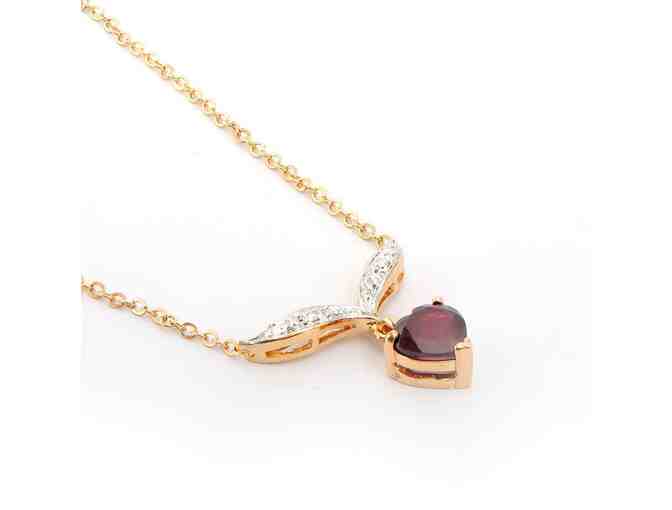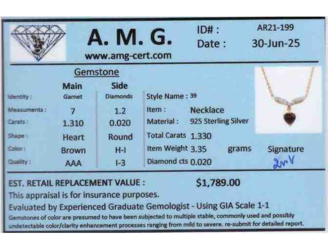 This elegant 19-inch designer necklace is crafted from 18K gold-plated 925 sterling silver and features a stunning 1.31-carat heart-shaped natural brown garnet accented by two round natural diamonds (0.02 carats total). Weighing 3.35 grams, this AAA-grade piece comes certified by AMG and has an estimated retail value of $1,789.