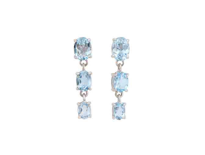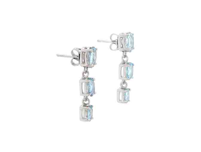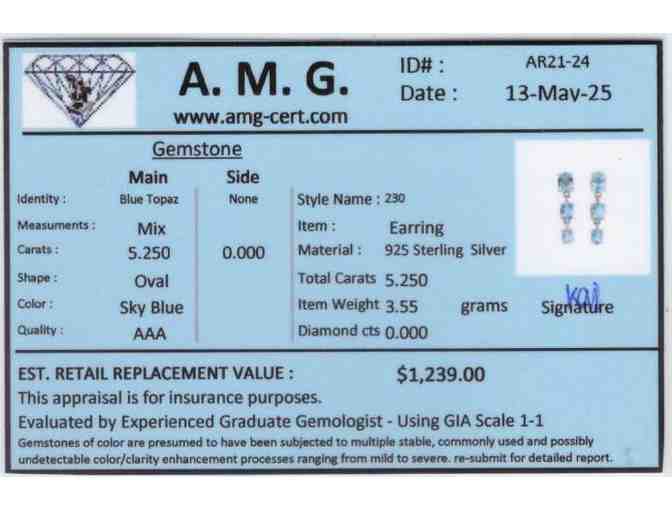 This pair of rhodium-plated 925 sterling silver designer earrings (3.55 grams) features 5.25 carats of natural sky-blue oval topazes in mixed sizes. Certified by AMG, this elegant set carries an estimated value of $1,239.