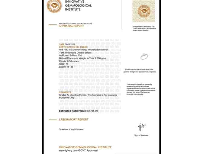This stunning size 7.5 ring features a round brilliant cut natural diamond totaling 0.34 carats, set in elegant 14K white gold (2.30 g). The diamond boasts H–I color and I1–I2 clarity, and the piece includes certification from the Innovative Gemological Institute (IGI).