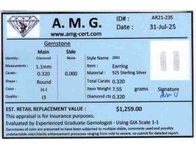 This stunning pair of .925 sterling silver earrings (7.55 g) is adorned with 42 round natural diamonds (totaling 0.32 carats, 1.1 mm each) featuring H–I color and I3 clarity. Certified by AMG, these earrings combine sparkling elegance with refined craftsmanship.