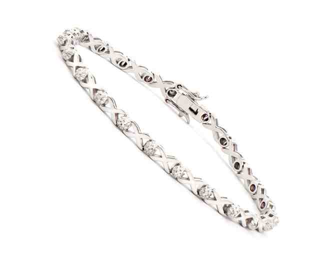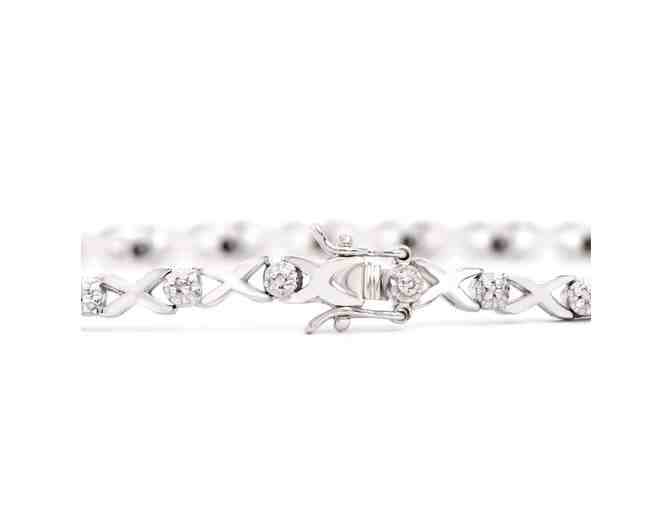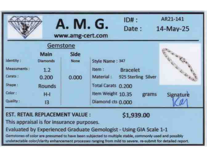 This rhodium-plated bracelet (10.35 g) is adorned with 23 round natural diamonds (1.2 mm, H–I color) and comes certified by AMG, with an estimated value of $1,939.