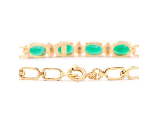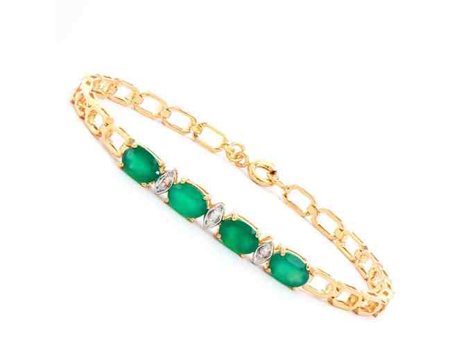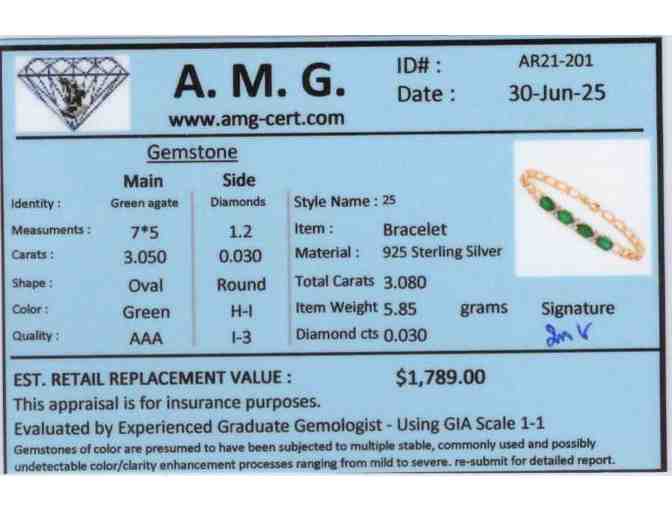 This luxurious 18K yellow gold-plated bracelet (5.85 g) features four natural oval green agates (7x5 mm) accented by three round natural diamonds (1.2 mm, H–I color, I3 grade). Certified by AMG, this elegant piece is valued at $1,789 and radiates timeless sophistication.