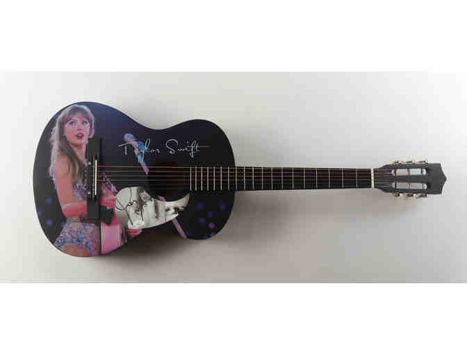Acoustic guitar measures approximately 38" in length and has been hand-signed on a CD cover that has been repurposed as a pick-guard by Taylor Swift.