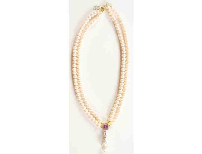 One Double Strand Freshwater Cultured Pearl Necklace With Amethyst Enhancer. Mounting Is Yellow Gold Over Sterling Silver. Measures 18 Inches In Length.