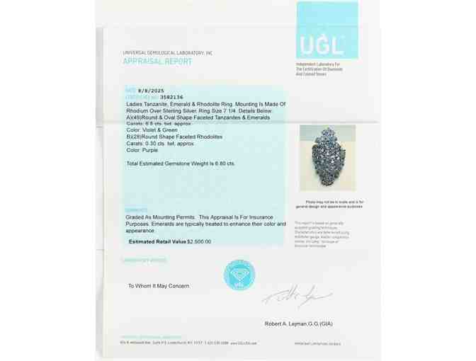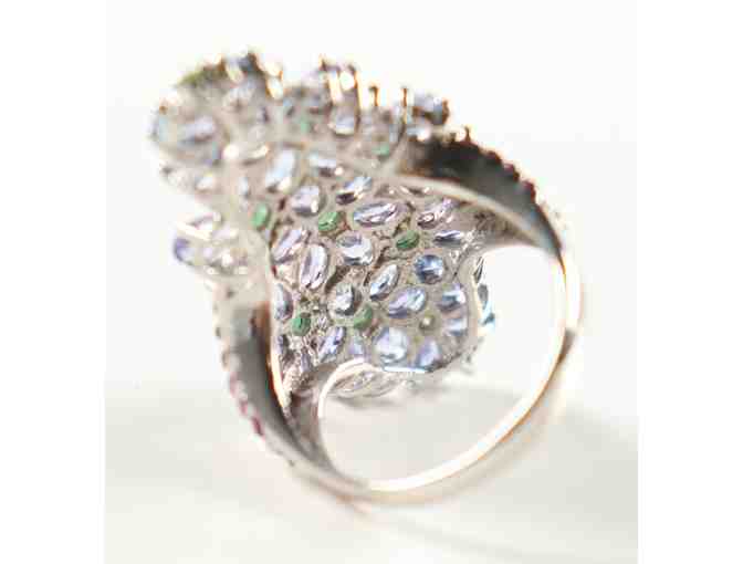 Bid now to win this New 6.80 CTW Tanzanite, Emerald & Rhodolite Ring