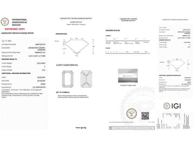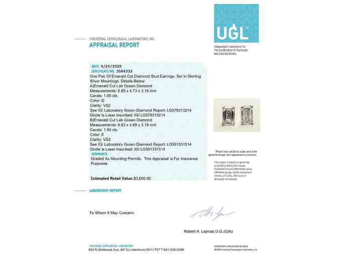 This piece includes paperwork from Universal Gemological Laboratory (UGL) and 2 from International Gemological Institute (IGI).