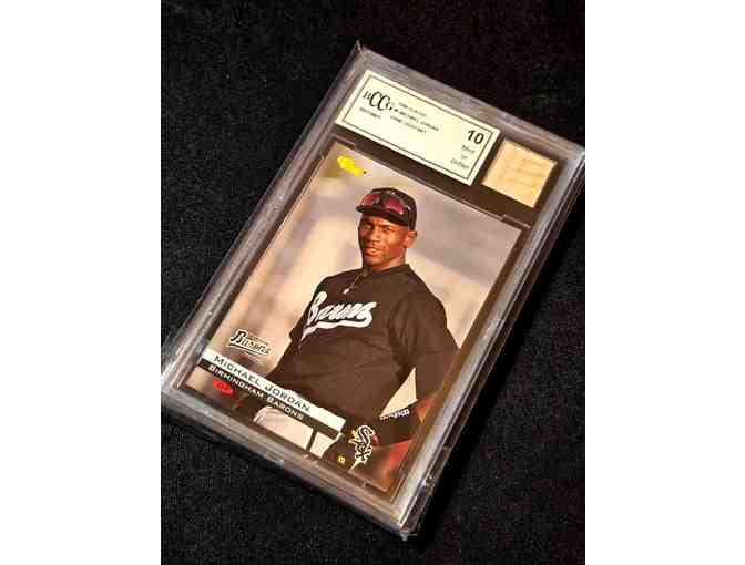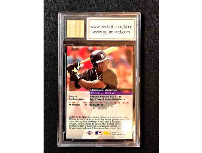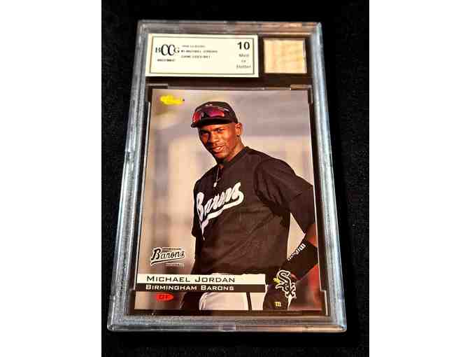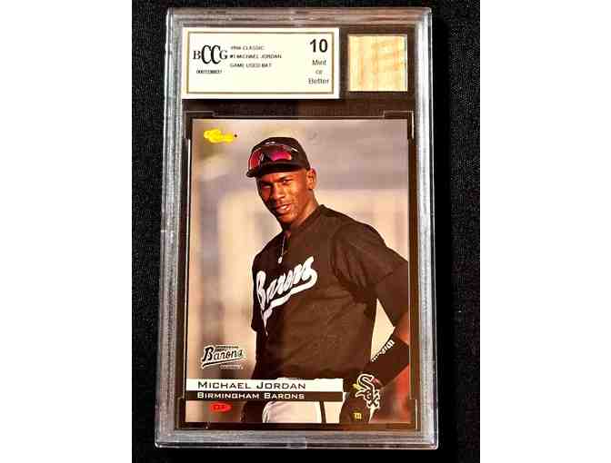 Up for auction is a 1994 Birmingham Barons #1 rookie‑card featuring Michael Jordan, graded a flawless BCCG 10, and embedded with a genuine game‑used bat from Jordan’s rare minor‑league baseball stint — a virtually unmatched convergence of legend, rarity and provenance.