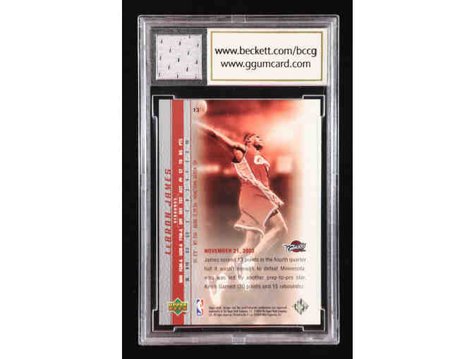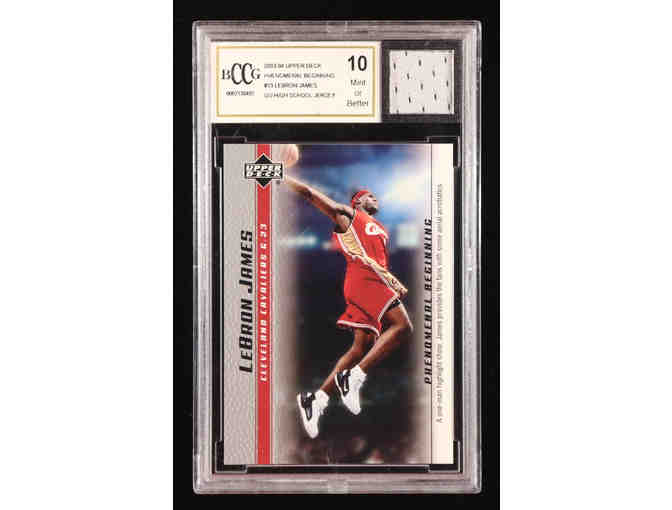 Up for auction is an ultra‑premium collectible: the **LeBron James 2003‑04 Upper Deck “Phenomenal Beginning” #13 rookie card graded a perfect BCCG 10, and embedded with a genuine high school game‑used jersey piece — a rare combination of rookie era provenance, premium grading, and relic material that offers enthusiasts a standout centerpiece for any elite collection.
