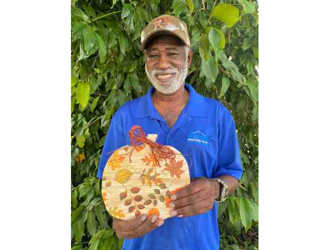 These handcrafted pumpkins are made in LARC’s Woodshop using natural wood, Mod Podge, and layered craft paper for a rustic, textured finish. Each one is hand-detailed with painted accents and ribbon touches, giving every pumpkin its own personality. Sweet, homespun, and full of charm. 8.5"x6"
