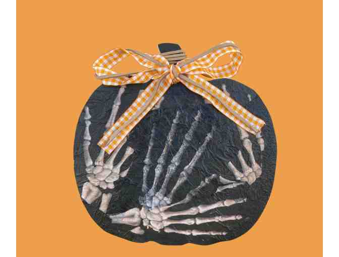 These handcrafted pumpkins are made in LARC’s Woodshop using natural wood, Mod Podge, and layered craft paper for a rustic, textured finish. Each one is hand-detailed with painted accents and ribbon touches, giving every pumpkin its own personality. Sweet, homespun, and full of charm. 8.5"x6"
