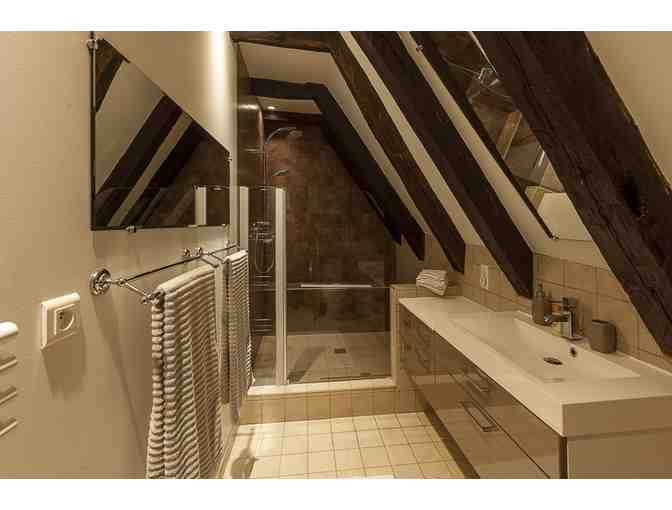 On the top floor there is a large master bedroom with a king sized bed. A second bedroom next-door has two twin beds, that can be made up as a king. Both bedrooms share a beautifully decorated bath room with large walk-in shower, toilet and sink. A landing separates these two rooms.