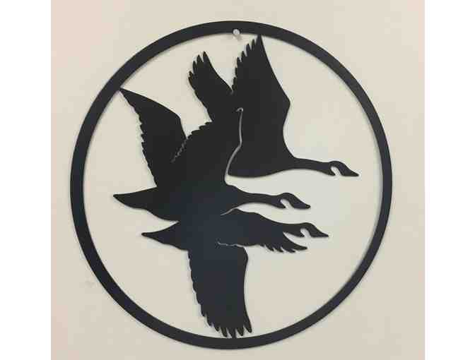 Precision laser cut out of 16 gauge steel, this image of flying Canadian Geese measures 12" in diameter. It is powder painted in black. Both sides are finished so can be reversed.