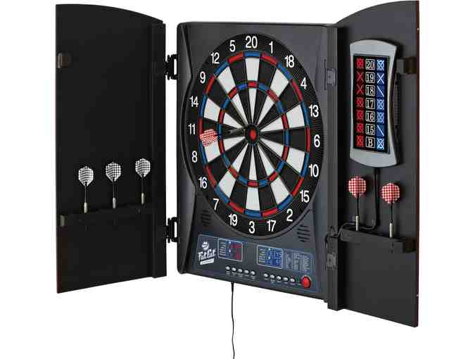 Who This Is For The Fat Cat Mercury Electronic Dartboard is designed for adult hobbyists and social entertainers who want a professional-grade experience in a compact footprint. It is the ideal solution for those looking to add a competitive edge to a man cave, basement game room, or home bar while keeping equipment neatly organized inside a furniture-style cabinet. How to Use Mount the cabinet to any wall surface using the included hardware and plug in the AC adapter for immediate power. Users select from 28 different game modes using the intuitive front-facing buttons. The automated system handles all scoring and player rotations, allowing up to 8 individuals to compete simultaneously without manual record-keeping. After each game, the display shows your Point Per Dart and Marks Per Round averages for performance tracking. Product Dimensions 24 in L x 18.5 in W x 2.6 in H | Weight: 10.85 lbs