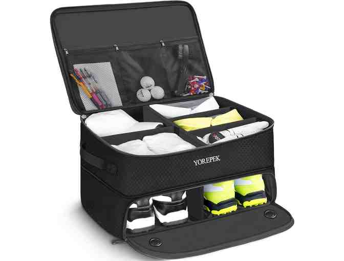 SEPARATE STORAGE FOR 2 SHOES: YOREPEK golf trunk organizer for car is upgraded on storage compartments, having separate shoes compartment on the bottom layer, to store 2 pairs of shoes up to size 11; The bottom compartment is with ventilated holes to keep air flowing around shoes; And the bottom storage space is made of polyester, which is easy to clean