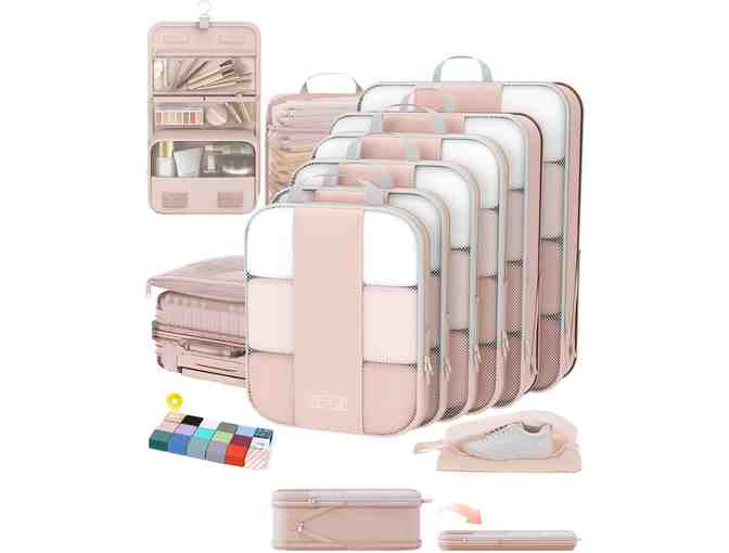 All-in-One Travel Storage Solution - Say goodbye to chaotic packing! This comprehensive set includes four compression packing cubes in varying sizes (XL, L, M, S) to accommodate everything from bulky coats to delicate tops. Plus, enjoy added convenience with a hanging toiletry bag, shoe bag, machine-washable laundry bag, and versatile pouch—all designed to keep your luggage perfectly organized and clutter-free.