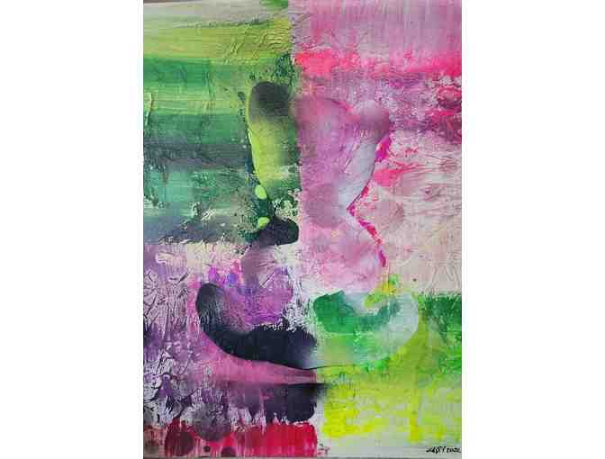 Celebrate the vibrant beauty of nature and compassion with "Nature’s Embrace," a one-of-a-kind painting by the acclaimed artist Galfi. This striking piece features a harmonious blend of lush greens, bold purples, and radiant pinks, accented by bold textures and abstract forms. Hidden within the vibrant layers is the tender silhouette of a teddy bear, representing warmth, care, and the heartfelt mission of Teddy Bears with Heart.