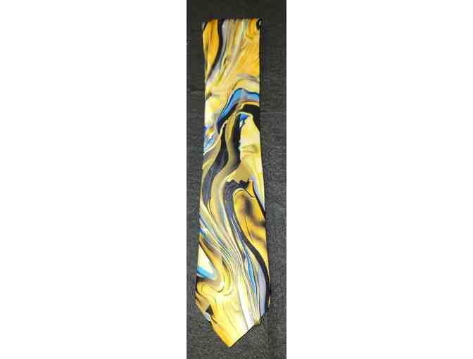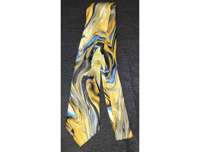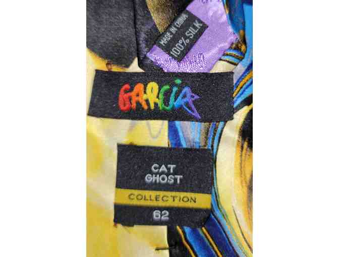 This necktie is a Jerry Garcia Collector's Edition tie from the "Urban Cat Ghost" collection. The design is inspired by an original abstract painting by the late Grateful Dead guitarist Jerry Garcia.