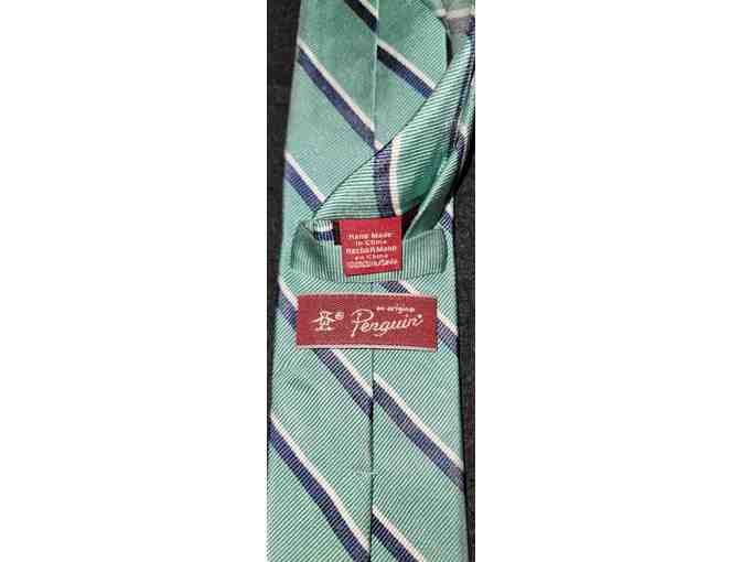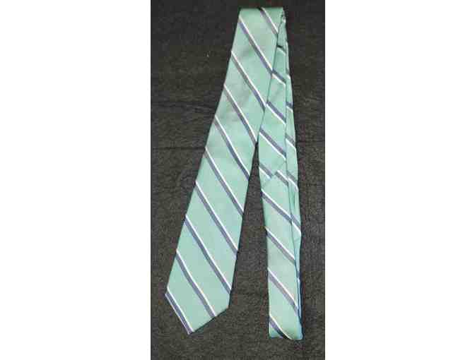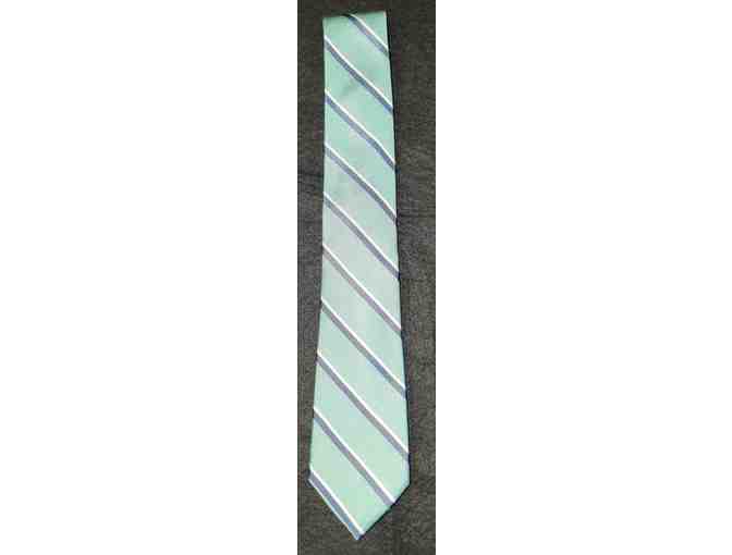 This is an Original Penguin Seaside Stripe Necktie in sea glass green with blue and white stripes.