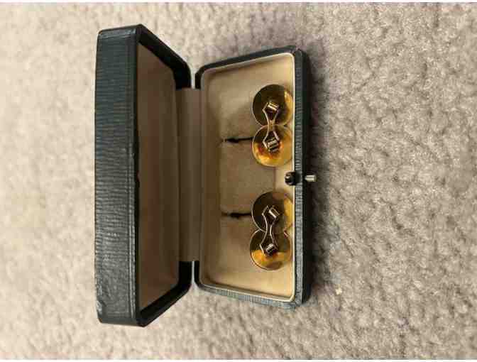 Most unique item in the Auction. This arrived today from an Estate Sale. The Cufflinks were worn on this Man's WEDDING DAY (in 1920) and documentation of the age of the Cufflinks can be authenticated by the Owner, through Family Photos and copies of the original Marriage Degree. The Cufflink Owner (Russell) lived from 1897 to 1986; he was married in 1920 (and was the Great Grandfather of our Donor). The cufflinks were created as a "double-sided chain link" (in the vintage "Eduardian Style" style popular in the mid-19th Century) and they have a popular circular design. The cufflinks are marked as "10K Gold". Auction Item ALSO INCLUDES the original 1900's box.Item can be shipped nationwide to Winning Bidder - or pick up for FREE in Enfield, after the Auction. (Super-unique and historical item!)