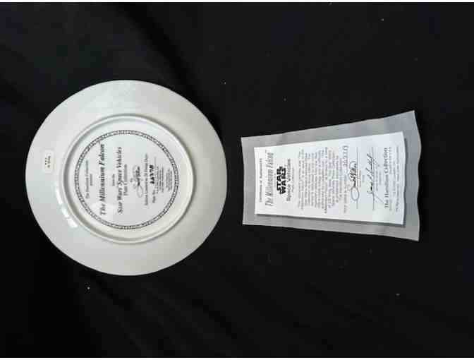 Numbered - and limited-run edition! Made in 1994 (so this is already 30 years old!), by Hamilton Collection. These plates were created for just 28 days (and they have all the original paperwork, boxes, and limited numbered Certificates). This plate shows "STAR WARS - Millennium Falcon" (from "The Empire Strikes Back") - as it escapes through an Asteroid Field while being chased by TIE Fighters. The Plate is numbered "#2637-B" (as shown on the back of the Plate and the accompanying original Certificate). It has NEVER been out of the original box in 30 years (except for this photo). The material is a fine porcelain, trimmed with 23K gold along the edges (and there are NO chips or marks anywhere). It includes the Original Box and Numbered Certificate. Item can be shipped nationwide to Winning Bidder - or picked up for FREE in Enfield, CT. An amazing collectible - for any Sci Fi Fan! (Note: We have 2 similar plates in this current Auction, to buy a matched set for a Gift.)