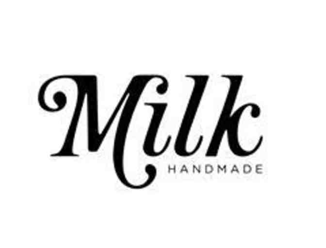 This auction item includes a $25 Gift Card to Milk Handmade, perfect for selecting clothing, accessories, or handcrafted goods in-store or online.