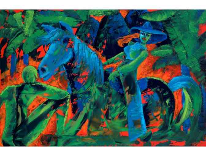 The Encounter / El Encuentrocaptures a moment suspended between movement and meaning where human presence and horse meet in a charged exchange of energy and color. Vivid strokes and shifting forms blur the line between figure and landscape, creating a scene that feels both instinctive and dreamlike. This work speaks to connection at first glance: a quiet recognition, a shared breath, a meeting that transforms both sides.