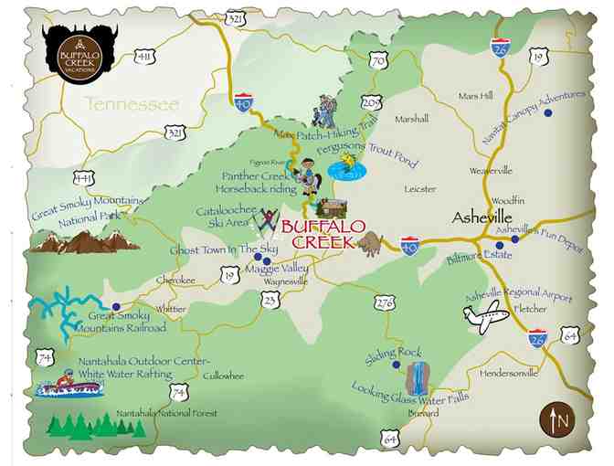 Experience the Smoky Mountains at its best! Take a short drive from Asheville to enjoy the sunrise over the Smoky Mountains and watch as the onsite buffalo come in for their morning oats. You will not be disappointed while you are sipping coffee on the deck of your gorgeous cabin. A stay at Buffalo Creek Vacations is surely one you will always remember.