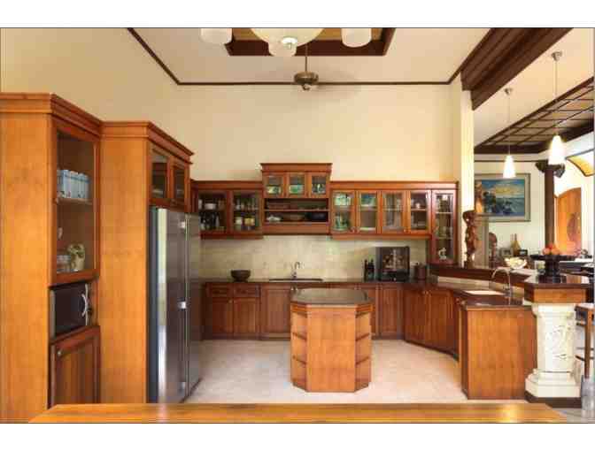 The kitchen is fabulous. Granite countertops, seating for 8 – 10 people, stainless steel appliances, gas stove with oven, and other modern conveniences - all surrounded by windows facing the beach, gardens and swimming pool area. The kitchen flows into the adjacent living area - with plush leather couches, koi pond, media center (boasting 60" plasma TV with an extensive DVD collection), and 650-gallon saltwater aquarium filled with colorful, local species. Wander the villa and enjoy the collection of local Asian artwork and intricate carvings.