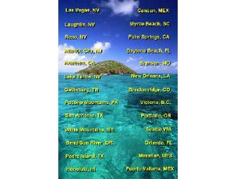 This certificate is valid for a reservation form, offering you and a guest accommodations in your choice of the cities above. Your cost is just a US$15 (paid with this certificate) registration fee and room taxes of $21.95. Reservations must be taken within 1 year. Reservations must be booked at least 60 days in advance. This offer is not connected with any timeshare presentation. No other purchase is required. This offer is restricted to persons ages 21 and older. Some restrictions on available dates may apply. Dates near major holidays are usually not available on this special offer. Transportation, meals and room taxes are not included. You will receive further information in the mail within 2 weeks of redeeming this certificate.
