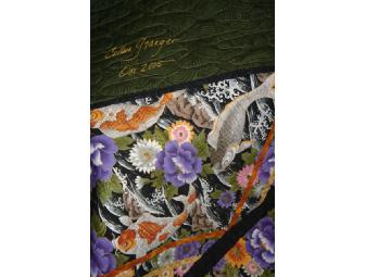 Colorful koi, water, mountains and blossoms abound in the fabric of this quilted Japanese wall-hanging. Signed by artist, Colleen Granger. Measures approximately 3'x3'.