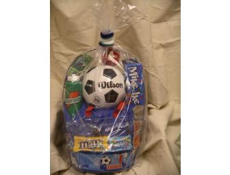Large gift basket filled with a soccer ball, gym bag, candy and water bottle for your little soccer fan.