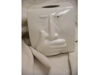 This charming and funny cream-colored ceramic tissue box holder features a man in mid-sneeze.