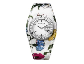 Make a statement with this beautiful White Flora Bandeau Gucci watch with diamonds. This watch has great features including a polished, stainless steel case, pearly white dial, faceted hands, 30 diamonds on bezel, battery operated Swiss made ETA quartz movement, flora silk fabric strap, scratch resistant sapphire crystal and is water resistant for up to 30 Meters / 100 Feet. It also comes with a 2 year international warranty.