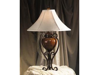 Manufactured by Kichler, this Westwood Collection table lamp is 32 inches high and 22 inches wide. The color is "tannery bronze with a cognac glaze." Shade not included.