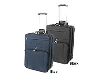Atlantic Odyssey upright suiter in navy blue - ease into your vacation or business trip with this stylish, durable and thoughtfully designed Odyssey 26" rolling upright from Atlantic. Expandable upright suitcase contructed of 1200 x 1200 denier two-tone polyester measures 25.5" high x 18.5" wide x 9" deep (+2.5" when expanded). Expands for additional packing space. Suiter section organizes longer garments for wrinkle-free arrival. "Go Bag" with drawstring closure for laundry, accessories, etc. Front pockets for last minute, easily accessible items. Bottle holster sized for cell phone or beverage. Features quiet, rolling in-line skate wheels, locking aluminum handle and easy-load bottom handle for lifting.