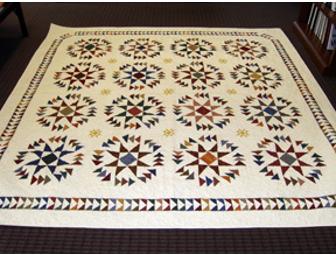 This large quilt measures 95 by 95 inches, which is queen size. It is also suitable to be used as a top layer on a king-size bed. This is a traditional quilt created especially for Wyoming Seminary's 32nd auction by Rosalie Kushner, grandparent of Stephen '07, Katie '09 and Andrew '14 Levandoski.