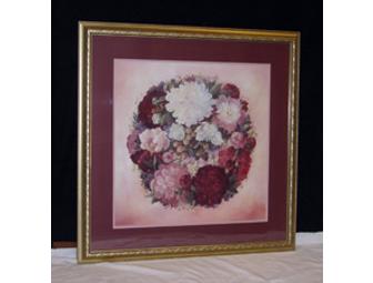 A 31 by 37 inch, gold framed print of roses in pinks and greens. Coordinates perfectly with "Peonies" and "Courtyard Prints."