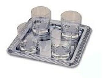 Reed and Barton's Chess Collection: four old fashion glasses etched with chess pieces, on a silver plated tray.