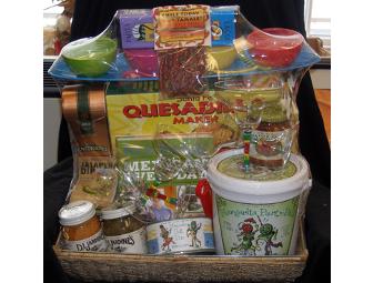 A fun and useful basketful of items for your next tequila party: a quesadilla maker, Gran Centario Tequila, margarita salt tub, margarita glasses, frozen margarita party pail, "Mexican Everyday" cookbook, four jars of gourmet salsa, fajita and taco seasonings, swizzle stick set, set of dip bowls on a tray with individual spoons, cocktail napkins.