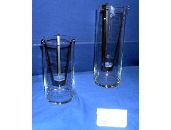2 clear glass cylinder holders measuring 11" and 8" in height, each with a 4" diameter. Tealight holders are black metal. This stylish duo makes an impact on table or mantle.