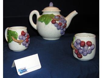 This hand-crafted pottery set includes a 4-cup tea pot and 2 matching mugs.The tea pot is a serving pot and not recommended to be put on a stove. All items are food and dishwasher safe.