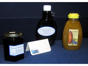 Worcester's Wild Blueberries is owned by Maine alums Everett '61, '66G, and Lee '65 Worcester. This set includes jam, honey and syrup. Contact Worcester's Wild Blueberries at 1-800-464-5263.