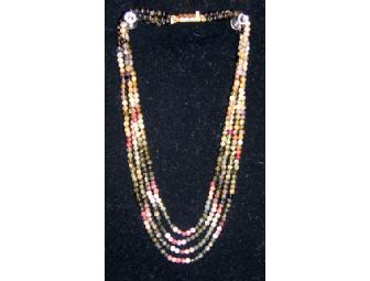 This truly beautiful 4-strand necklace is made of multi-colored tourmaline and measures 17 inches in length. Designed in Maine by Anita and David Flood and Adam Weir, dba Casual Elegants, one of our Homecoming Craft Fair vendors.