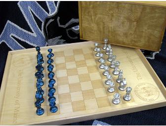 This unique and stunning chess set is manufactured on campus at the Advanced Manufacturing Center. The chess pieces come in a custom wooden storage box. The chess board is embossed with the University Seal. Display your UMaine pride with this beautiful set.